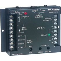 The Bogen VAR1 Voice-Activated Relay features a Double Pole Double Throe (DPDT) audio signal activated relay device. The activating device can be a microphone pre-amp or any 70V, 25V, or 600-ohm line level inputs. The audio output is an isolated 600-ohm transformer. The VOX detect circuit also includes volume, sensitivity, and delay controls. Its applications include muting a sound system in response to a microphone or telephone page, activation of accessory security equipment or activation of a zone paging module. It sensitivity can be adjusted according to the needs of the application and operates from a DC power source.