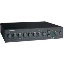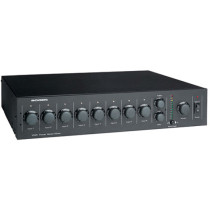 VMIX Power Vector Mixer-Pre-Amplifier from Bogen features 8 input module bays each with independent volume controls allowing up to four levels of priority between modules. In addition, the VMIX Power Vector Mixer-Pre-Amplifier has a motorized master volume control with a remote control, bass and treble control, peak hold switch, unbalanced output jack and balanced output terminal. Optional security covers prevent tampering with settings. With a wide variety of operational features and functions for advanced audio performance, VMIX Power Vector Mixer-Pre-Amplifier is well suited for various applications, including foreground music, background music and paging.