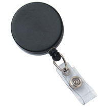 Part Details: Badge Reel, Black /Chrome, 1-1/2 (38mm), Heavy-Duty Badge Reel with Cord and Clear Strap, with Slide-Type Belt Clip. Sold in quantities of 25. Priced per 25 units.