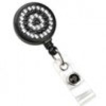 Part Details: RHINESTONE BADGE REEL, BLACK ROUND REEL WITH BLACK AND CLEAR RHINESTONES, NPS BELT CLIP, CLEAR VINYL STRAP WITH ONE BLACK RHINESTONE ON STRAP SNAP. Quantity: 25.