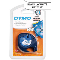 Part Details: 12mm Plastic Letratag Label Cassette, White W/Black Type, 13' Long Tape, 1 Tape/Box
